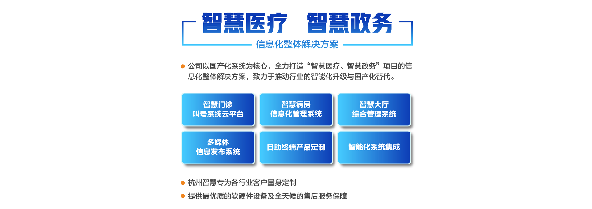 杭州智慧科技有限公司初創(chuàng)于2003年,總部位于重要的電子商務中心中國杭州公司主營業務有:智慧分診叫號系統、智慧病房醫(yī)護對講系統、智慧大廳綜合管理系統、智慧政務管理系統、智慧多媒體信息發(fā)布系統、導診系統及各自助終端產品定制。專為各行業客戶量身定制。公司已有20余年行業經驗沉淀積累,擁有優(yōu)秀的產品外觀設計師和各類中高級專業技術工程師,確保所研發(fā)的產品具有行業領先的外觀及可靠的技術性能。并擁有權威部門頒發(fā)的各類知識產權及專利證書,30多項資質證書、800多個合作伙伴、2000多個項目成功案例經驗。 智慧產品已遍及全國各醫(yī)療、政務、金融、通訊、公安、工商、稅務等行業,形成以“立足杭州、輻射長三角、拓展全國”的戰(zhàn)略發(fā)展格局,產品經過歷年不斷創(chuàng)新,形成專業化、平臺化,致力于成為智慧產品的領軍企業。 公司建立了完善的技術培訓及售后服務中心,并設24小時熱線咨詢電話解答用戶反饋的問題。同時應客戶要求定期派技術人員到 全國各地進行技術指導輔助用戶正確使用智慧產品并能獨立安裝、調試、日常維護等工作。提供最優(yōu)質的設備及全天候的售后服務保障,智慧永恒不變的服務宗旨——致力于客戶的滿意與成功!...